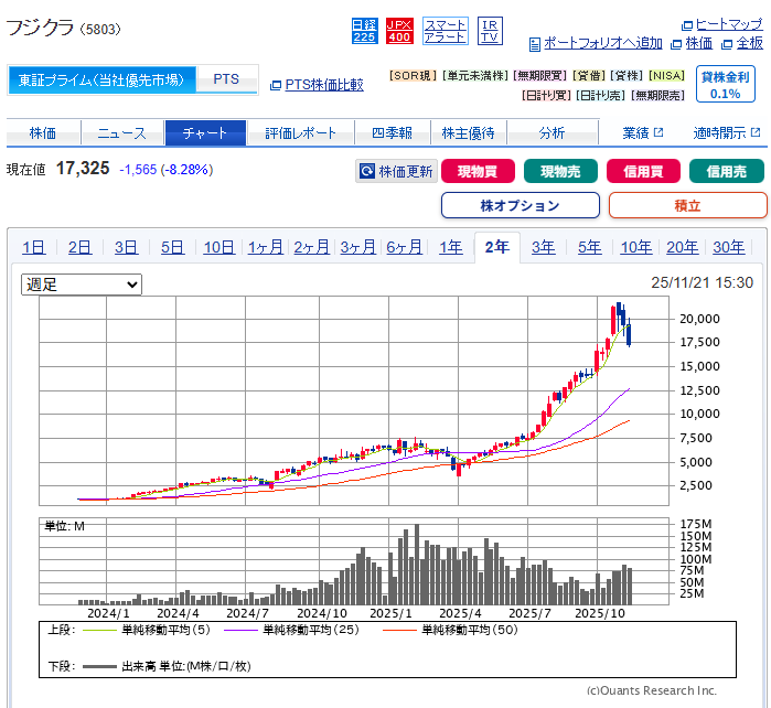 これもデータセンターに必要なケーブルとかそのあたりの会社で半年で5000円くらいから21000円位と4倍程度としっかりと株価が上がってる。昔将棋部でフジクラさんとかかわったことがあって会社は知っていて当時買っておけば今頃40倍ですよ(´;ω;`)ウゥゥ