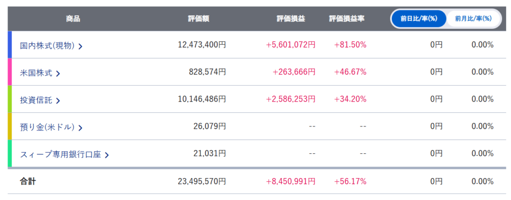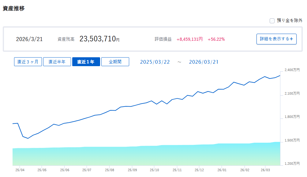 微妙な上げ下げを繰り返してジワリと上がってる感じです。ここ最近毎週月曜日は爆下げして途中盛り返すを繰り返している感じがします。ちょうど一年前と比べると資産でいうと600万円、評価益でいうと+530万円増えてます。配当金の再投資、信用取引での小遣いを稼いで再投資って感じでやってます。今年からは毎月10万円積み立て投資分も入っています。