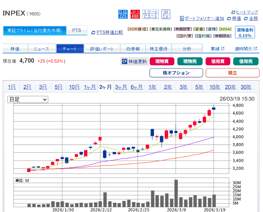 2月に決算悪くて4000円から3450円位に爆下げしてからの回復です。100万円分ぐらい値上がりほかの株がほぼお亡くなりの中INPEXのおかげで何とか耐えてます。分散ポートフォリオ大事!